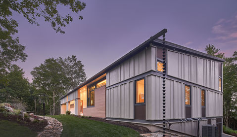 Separating the nearby road to the north from the woodlands to the south, this linear home creates a place where a couple and their dog can appreciate the mountain setting. Views, daylight, and breezes flowing through carefully considered gaps in a composition of stacked blocks, offer an intimate relationship with the natural surroundings. Thick walls provide thermal protection, niches for occupation, and a heightened sense of shelter. A sunny terrace, with steel trees supporting a canvas canopy, adapts to seasonal occupation. This sustainable residence promotes a relationship with nature, employs efficient construction, and offers an environment for “aging in place.” - Photography by Michael Blevins -